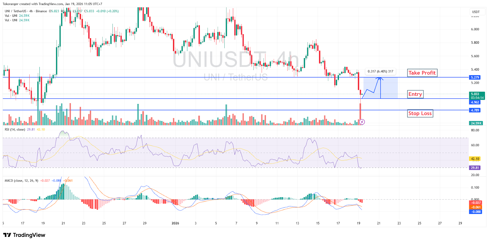 UNI/USDT (timeframe 4 jam) saat ini berada dalam tekanan turun yang cukup kuat. Volume melonjak sangat tinggi dibanding sebelumnya, menandakan pergerakan yang serius dan didukung oleh bearish engulfing. Dari indikator, RSI berada di bawah 50 yang menunjukkan buyer melemah, sementara MACD sudah berada di bawah garis 0 dengan histogram merah yang mengonfirmasi downtrend.