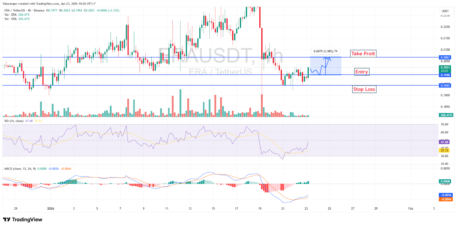 ERA/USDT (timeframe 4 jam) saat ini masih berada dalam tren turun, namun mulai muncul tanda-tanda pantulan jangka pendek. Terlihat ada candle bullish yang sedang berjalan dan RSI sudah golden cross serta bergerak naik mendekati level 50, menandakan peluang kenaikan mulai terbuka meski belum terkonfirmasi penuh.
