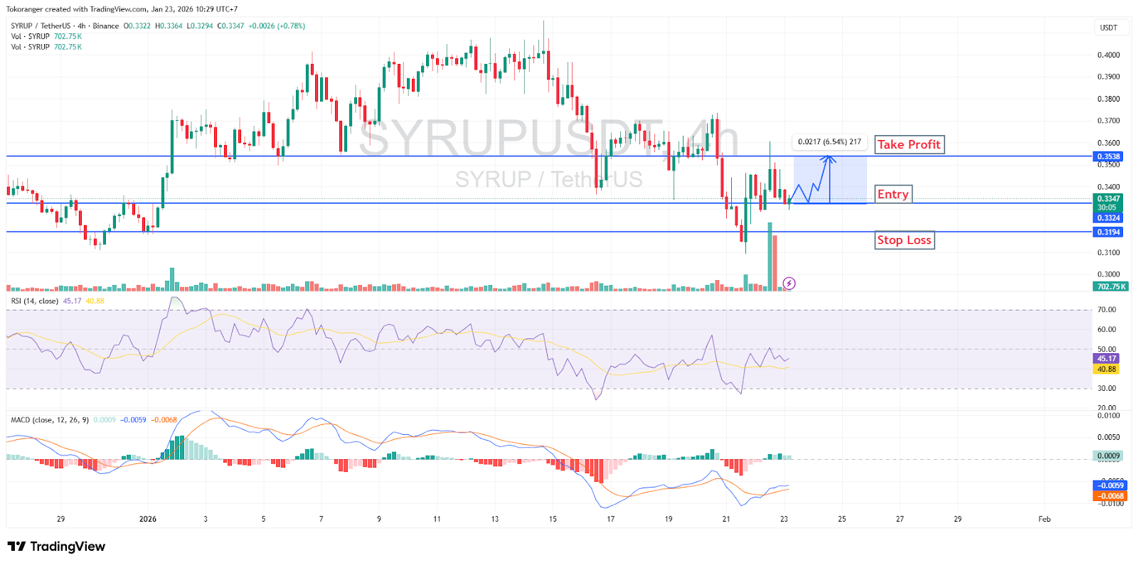 Dari sisi MACD, tren utamanya masih cenderung turun, meski untuk jangka pendek ada peluang pantulan. RSI sudah membentuk golden cross dan berpotensi menembus level 50, yang menandakan peluang bullish jangka pendek masih ada. Secara keseluruhan, kondisi SYRUP cenderung sideways ke arah bullish ringan, dengan skenario entry di 0,3324, stop loss di 0,3194, dan take profit di 0,3538, sambil tetap menjaga manajemen risiko karena pergerakan belum terlalu kuat.