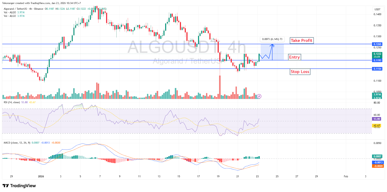 MACD juga mulai mengarah naik, meski secara tren besarnya masih tergolong menurun, sehingga sinyal ini lebih mengarah ke reversal jangka pendek. Dengan kondisi tersebut, skenario yang bisa diperhatikan adalah entry di 0,1193, stop loss di 0,1154, dan take profit di 0,1265, sambil tetap menjaga manajemen risiko karena tren utamanya belum sepenuhnya berbalik.