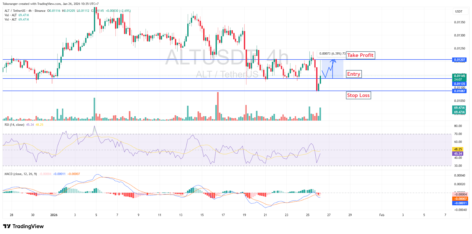 Dengan kondisi ini, ALT masih layak dipantau sambil disiplin risiko, dengan skenario entry di 0,01135, stop loss di 0,01087, dan take profit di 0,01207, dengan risk reward sekitar 1:1,3.