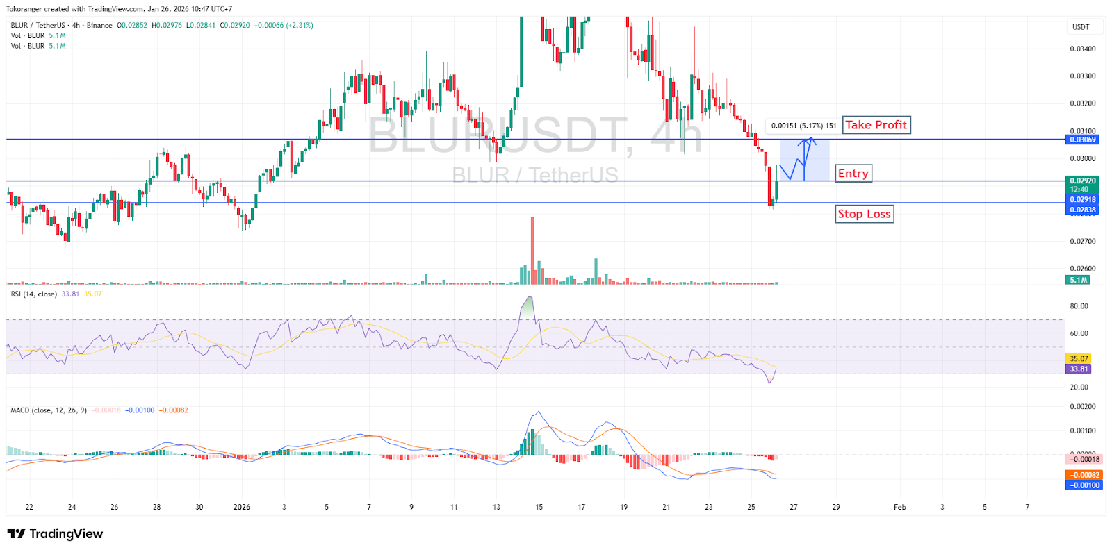 Secara keseluruhan, BLUR masih bearish secara tren utama, namun peluang pantulan teknikal cukup terbuka. Area entry bisa diperhatikan di 0,02918, dengan stop loss di 0,02838, dan take profit di 0,0309 sebagai area resistance terdekat, sambil tetap disiplin karena pergerakan ini lebih ke arah pullback daripada pembalikan tren besar.