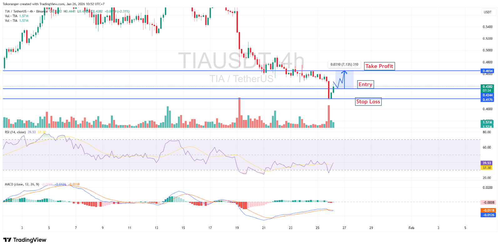 Volume relatif stabil, belum ada lonjakan kuat yang bisa menjadi konfirmasi reversal penuh. Dengan kondisi ini, TIA masih perlu diwaspadai dan dipantau, karena pergerakannya lebih cocok untuk pullback jangka pendek daripada pembalikan tren besar. Skenario yang bisa dipertimbangkan: entry di 0,4344, stop loss di 0,4176, dan take profit di 0,4654, dengan risk reward sekitar 1:2.
