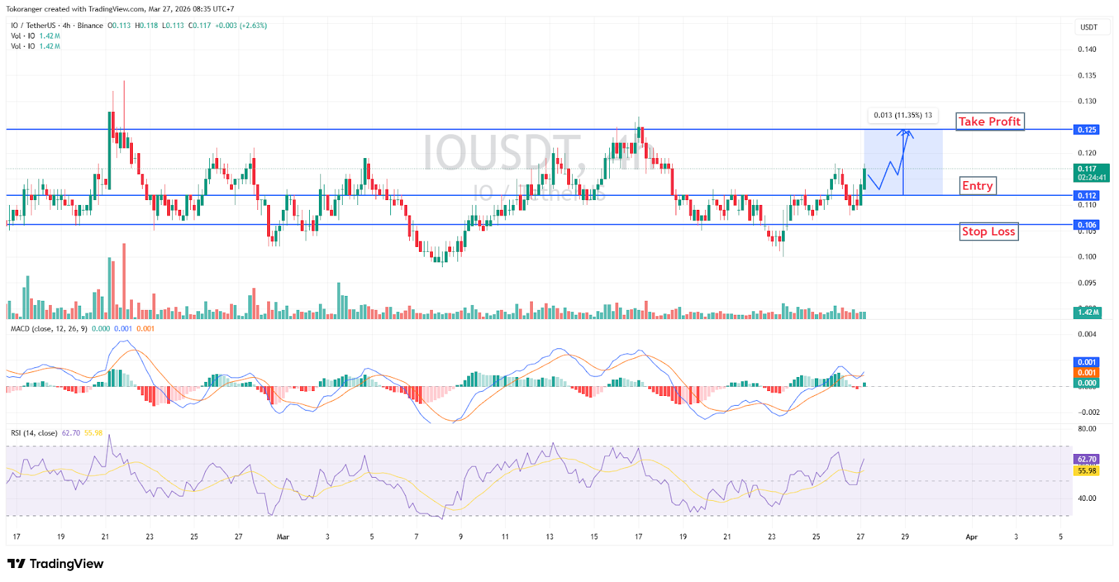 IO/USDT pada timeframe 4 jam menunjukkan kelanjutan tren bullish setelah breakout yang terkonfirmasi, dengan MACD yang kembali ke area positif dan RSI stabil di atas 50 sebagai tanda dominasi buyer.