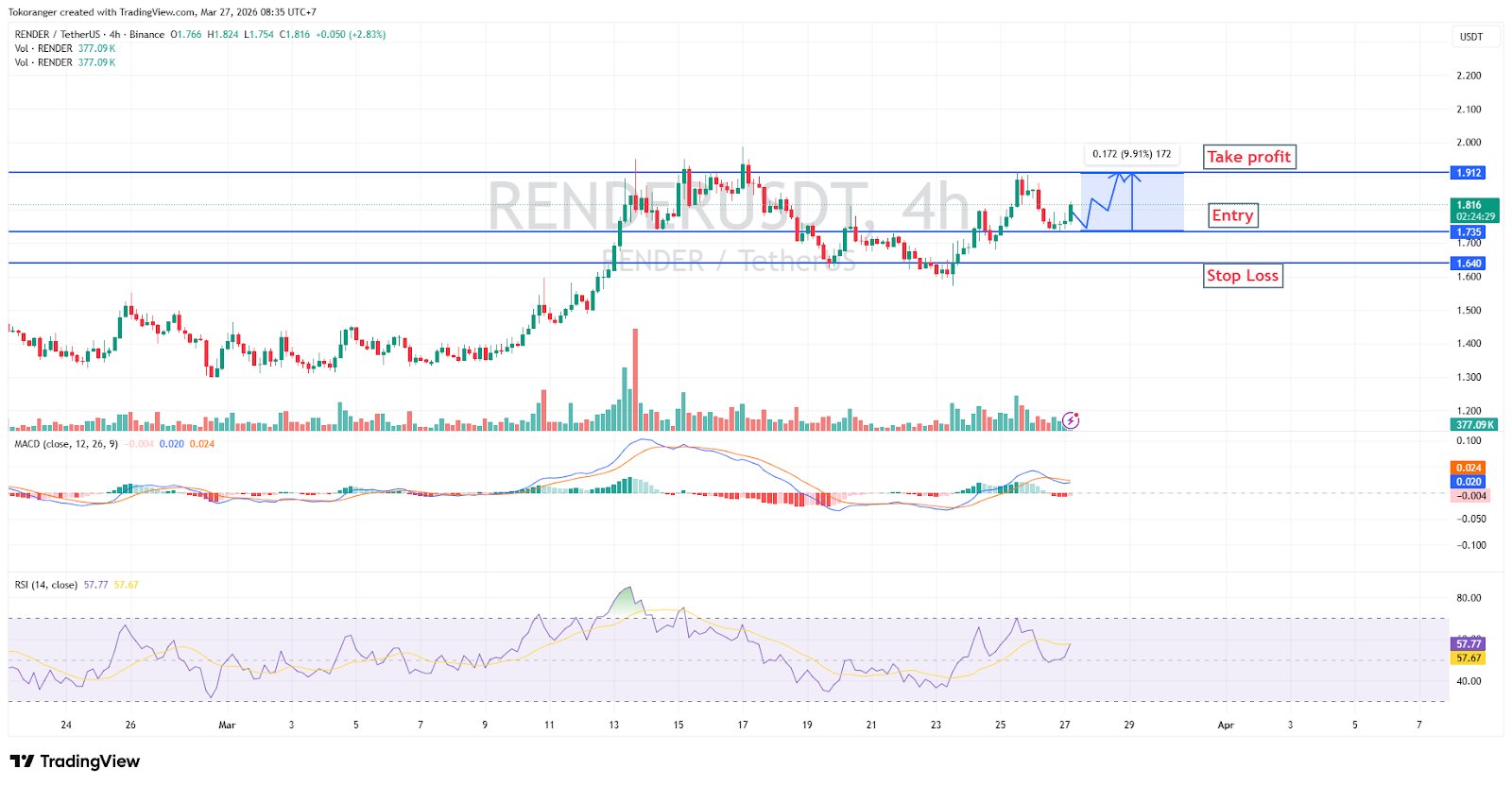 RENDER/USDT pada timeframe 4 jam menunjukkan upaya melanjutkan tren bullish, didukung RSI yang stabil di atas 50 dan MACD yang masih berada di area positif, meski ada potensi koreksi jangka pendek.
