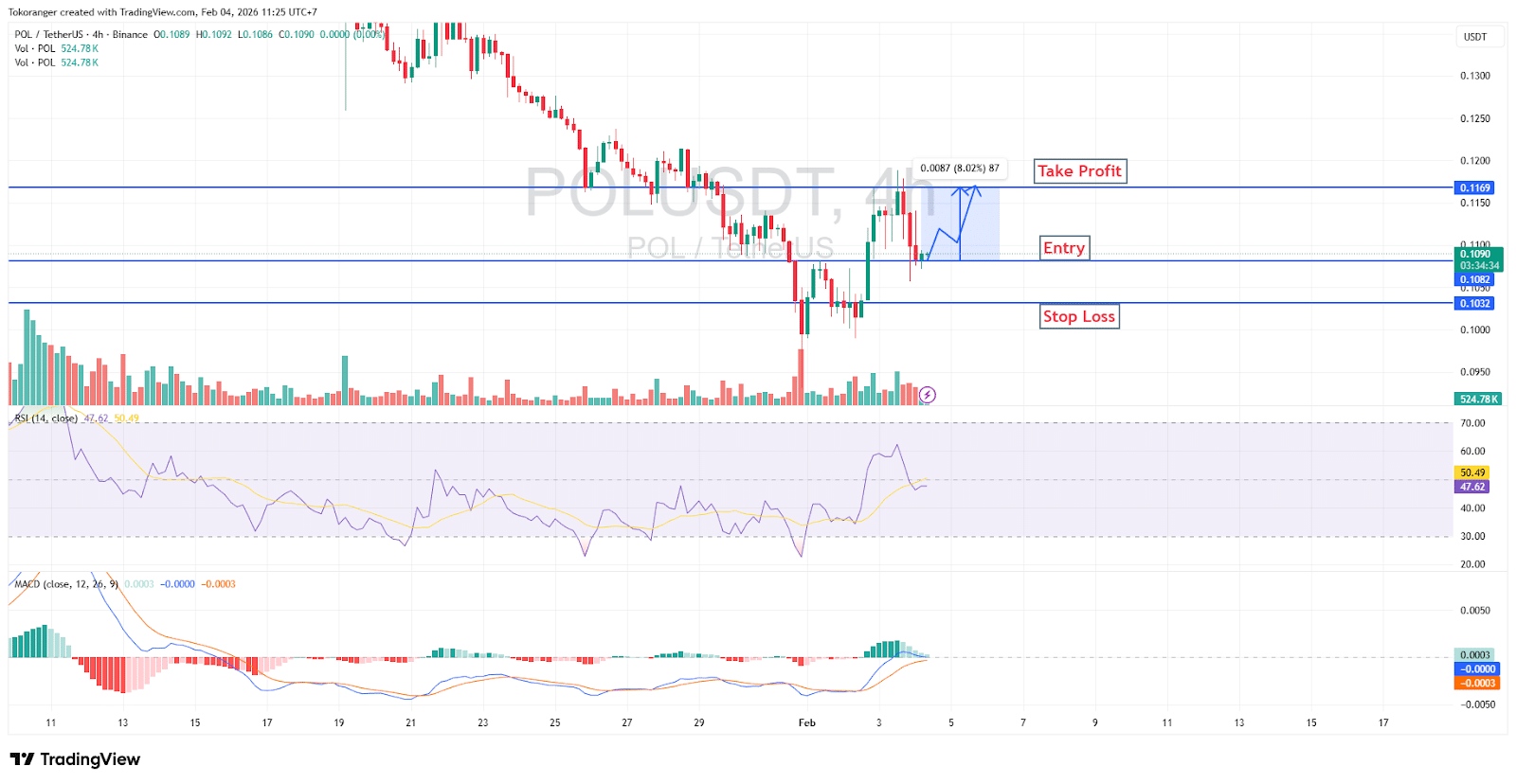 Meski begitu, volume mulai meningkat, memberi sinyal adanya respons pasar di area bawah. Secara teknikal, skema yang bisa dipertimbangkan adalah entry di 0,1082, stop loss di 0,1032, dengan potensi take profit di area 0,1169 apabila terjadi pullback lanjutan.