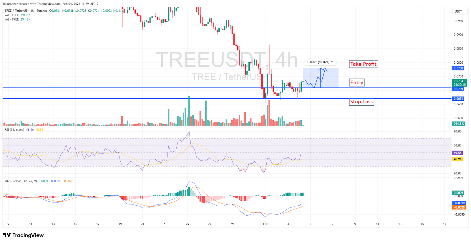 TREE/USDT di timeframe 4 jam mulai menunjukkan potensi kenaikan, meskipun tren besarnya masih downtrend. Dari sisi indikator, MACD masih berada di area negatif, menandakan tekanan turun belum sepenuhnya hilang.
