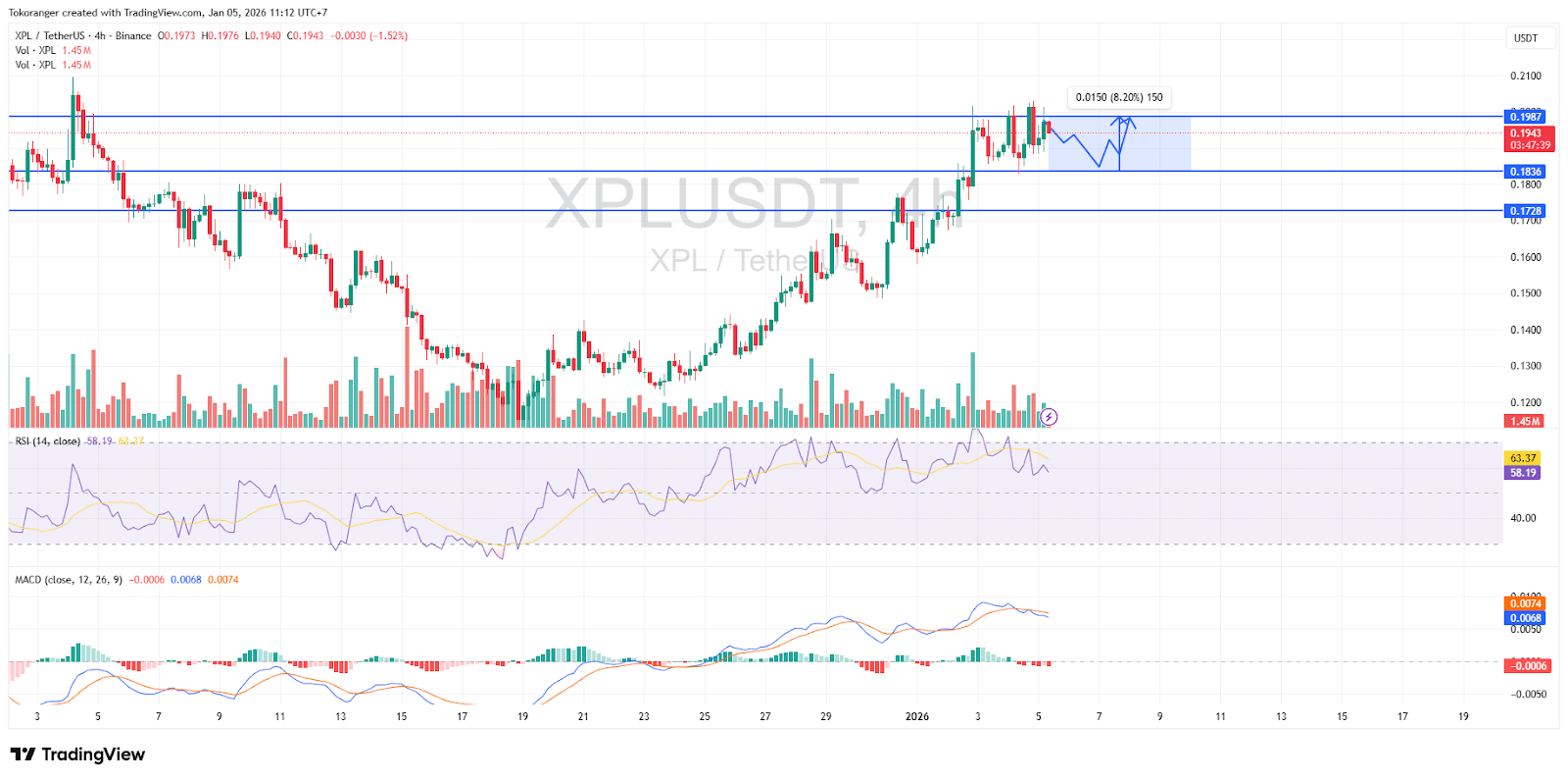 XPL/USDT pada timeframe 4 jam saat ini masih berada dalam kondisi cukup bullish, didukung RSI di kisaran 58-63 dan MACD yang masih berada di atas garis 0, menandakan tren utama tetap naik.