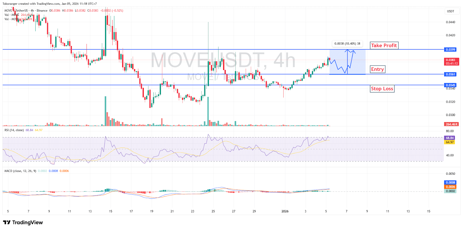 MOVE/USDT pada timeframe 4 jam saat ini masih berada dalam kondisi bullish, meski kenaikannya belum terlalu kuat karena volume relatif kecil dibandingkan fase rally sebelumnya, sehingga lebih terlihat sebagai fase akumulasi. RSI di area 64-68 mengindikasikan momentum beli masih dominan dan mulai mendekati overbought, sehingga potensi koreksi ringan tetap ada.