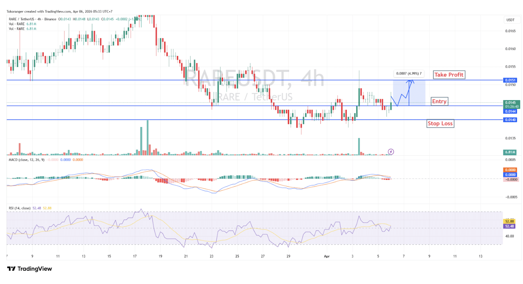 RARE/USDT masih dalam downtrend dengan pola lower high, namun mulai muncul peluang rebound jangka pendek didukung RSI di atas 50 dan MACD yang mulai mengarah positif; dengan volume yang masih relatif kecil, kenaikan belum terlalu kuat, sehingga skenario trade berada di entry 0,0144, stop loss 0,0140, dan take profit 0,0151 (±4,99%) sambil menunggu konfirmasi lanjutan.