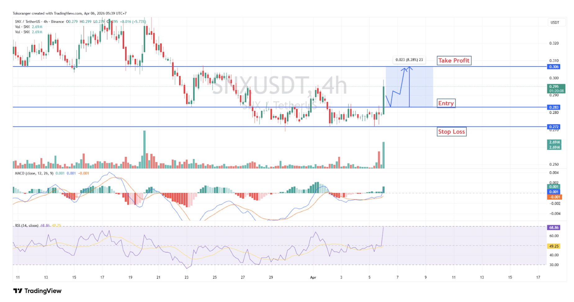 SNX/USDT menunjukkan kenaikan signifikan dengan dukungan lonjakan volume, MACD mulai berbalik ke arah positif, dan RSI naik ke area 60+ yang menandakan tekanan beli cukup kuat meski masih dalam fase sideways, entry di 0,283, stop loss di 0,272, dan target take profit di 0,306 (±8,28%).