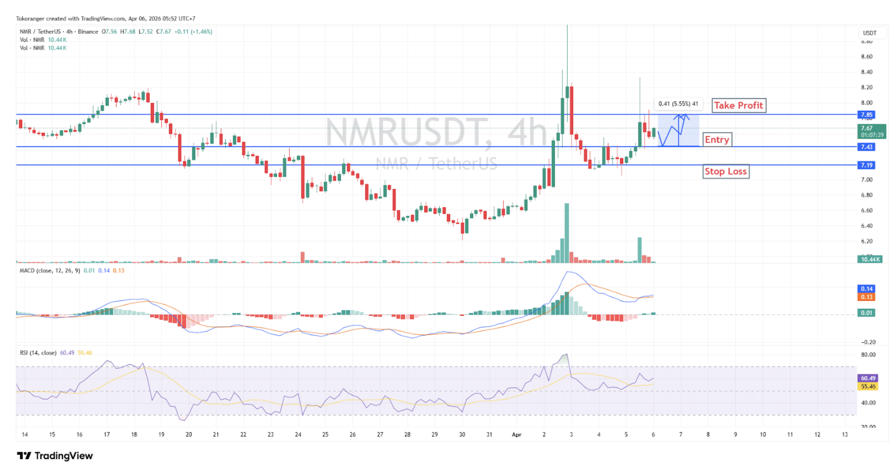 NMR/USDT saat ini berada dalam kondisi cukup bullish, didukung volume yang meningkat, MACD di area positif, dan RSI di sekitar 60 yang menandakan dominasi buyer. tren mengarah ke uptrend jangka pendek dengan potensi lanjutan naik menuju take profit di 7,85, entry di 7,43, dan stop loss di 7,19 (±5,55%).