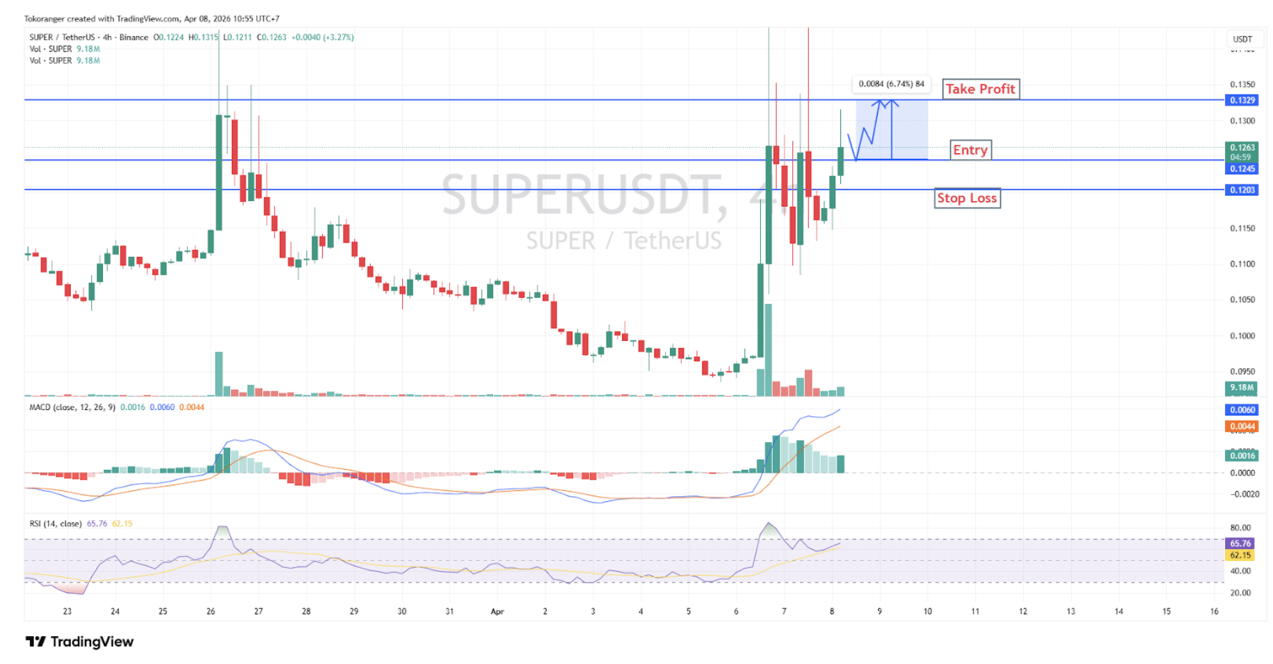 SUPER/USDT saat ini berada dalam kondisi bullish setelah breakout dari pola symmetrical triangle, dengan potensi melanjutkan kenaikan menuju resistance di 0.1329; didukung MACD yang terus menguat di area positif, RSI di sekitar 62 (belum overbought), serta volume yang mulai meningkat. Entry di 0.1245, stop loss di 0.1203, dan take profit di 0.1329 (±6,74%).