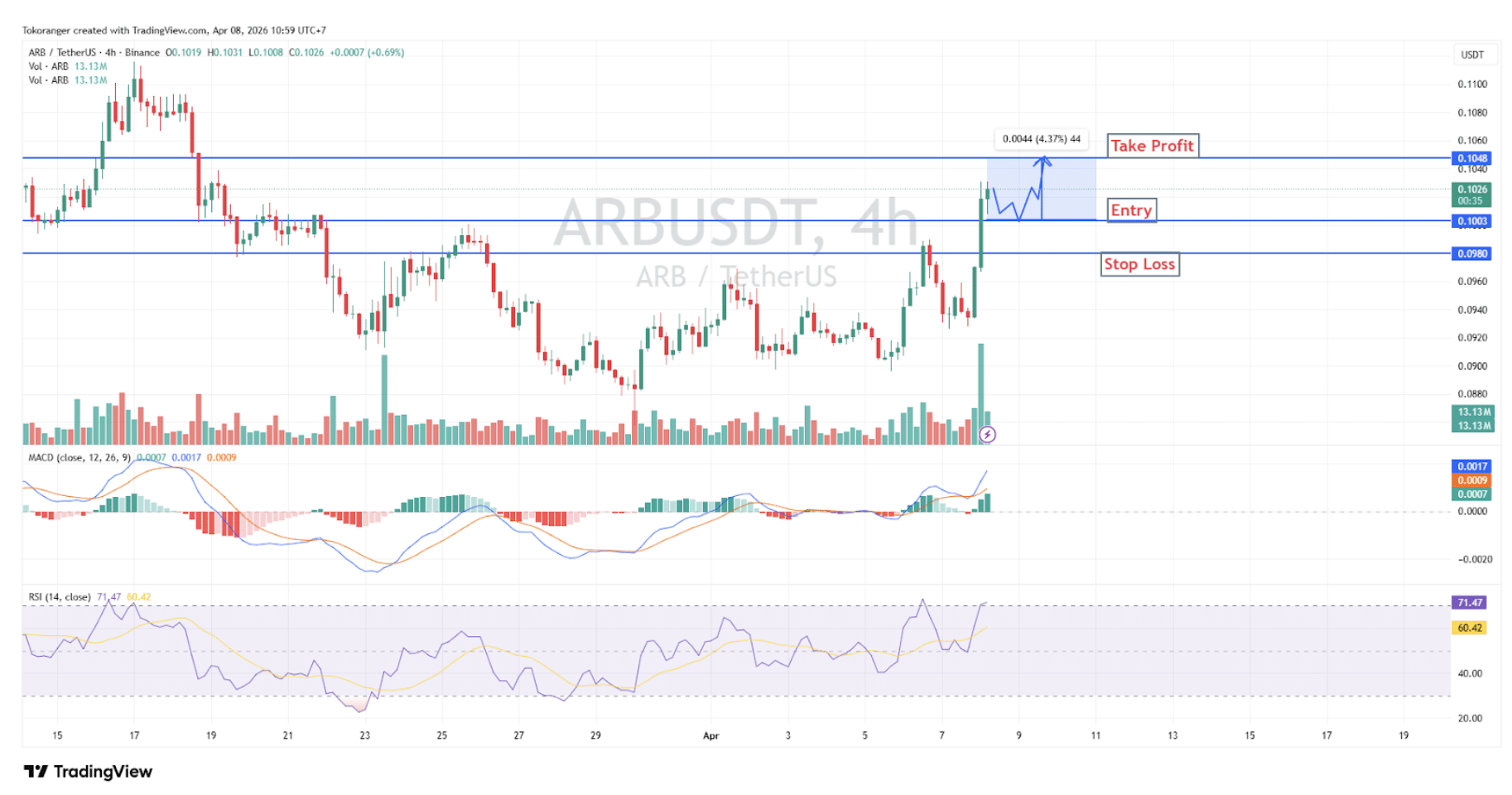 ARB/USDT saat ini berada dalam kondisi bullish setelah breakout resistance, didukung MACD yang kuat di area positif dan volume yang cukup stabil; namun RSI sudah di kisaran 60-70 menandakan mulai mendekati overbought sehingga rawan koreksi jangka pendek. Selama bertahan di area support, peluang kenaikan masih terbuka dengan entry di 0.1003, stop loss di 0.0980, dan take profit di 0.1048 (±4,37%).