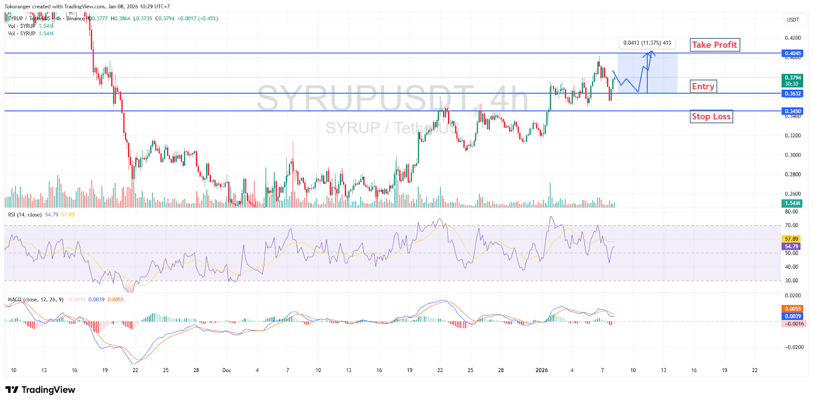 MACD juga mengonfirmasi hal yang sama, baru membentuk golden cross dengan dua histogram hijau awal, sehingga secara momentum peluang lanjut bullish masih terbuka. Untuk skenario jangka pendek, area entry berada di 0,5616, stop loss di 0,5412, dengan take profit di 0,6033 atau potensi kenaikan sekitar 7,45%.