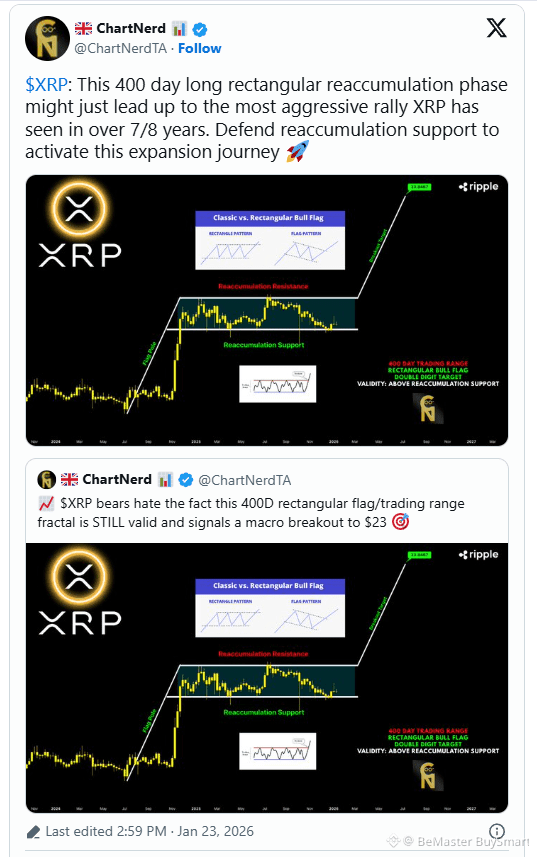 Analis kripto ChartNerd (@ChartNerdTA) mengungkapkan bahwa XRP telah membentuk pola rectangular reaccumulation, sebuah struktur teknikal yang kerap muncul sebelum terjadinya pergerakan harga besar. Pola ini menunjukkan fase akumulasi lanjutan setelah pergerakan naik yang kuat sebelumnya.