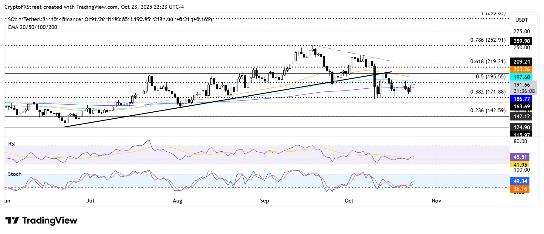 Dari sisi teknikal, SOL/USDT saat ini mencoba menembus area resistance penting di sekitar $195,5, yang bertepatan dengan Fibonacci Retracement 50% dan Exponential Moving Average (EMA) 100-hari.
