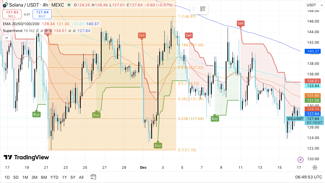 Berdasarkan grafik 4 jam, SOL saat ini diperdagangkan di bawah seluruh exponential moving average (EMA) utama, yakni EMA 20, 50, 100, dan 200. Kondisi ini mengonfirmasi momentum bearish jangka pendek yang masih mendominasi. Pola lower high dan lower low terus terbentuk, sementara indikator Supertrend tetap berada dalam mode jual.