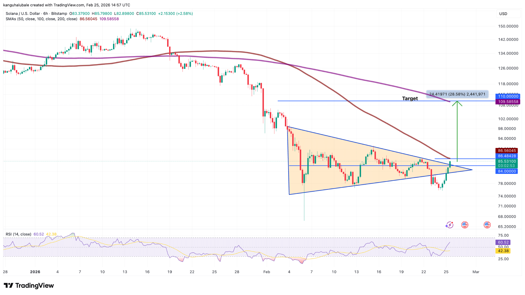 Dari sisi teknikal, grafik enam jam SOL/USD menunjukkan breakout dari pola symmetrical triangle. Pola ini sering diartikan sebagai sinyal kelanjutan tren setelah fase konsolidasi.