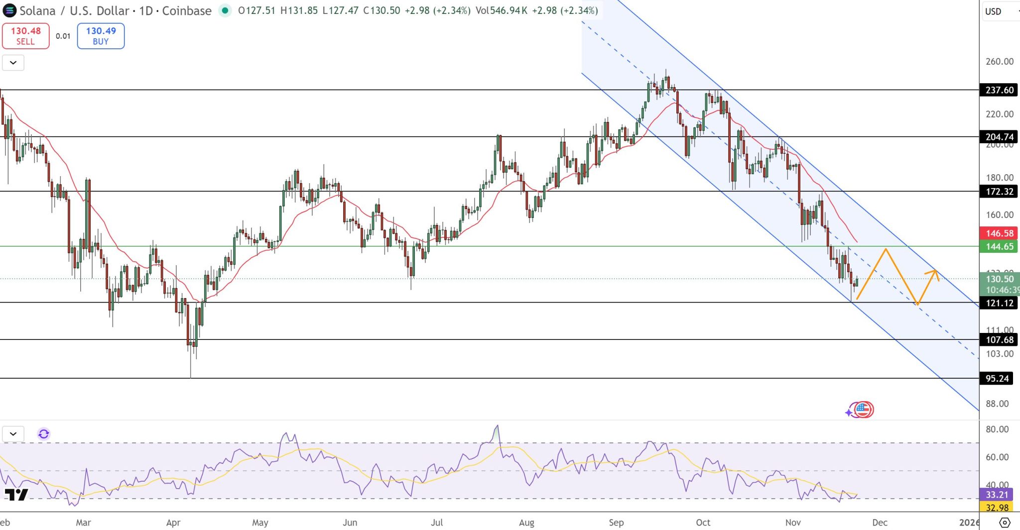 Jika muncul candle bullish yang kuat dari area $121–$123, SOL berpeluang untuk kembali menargetkan zona $144 sebelum melanjutkan pemulihan yang lebih besar.