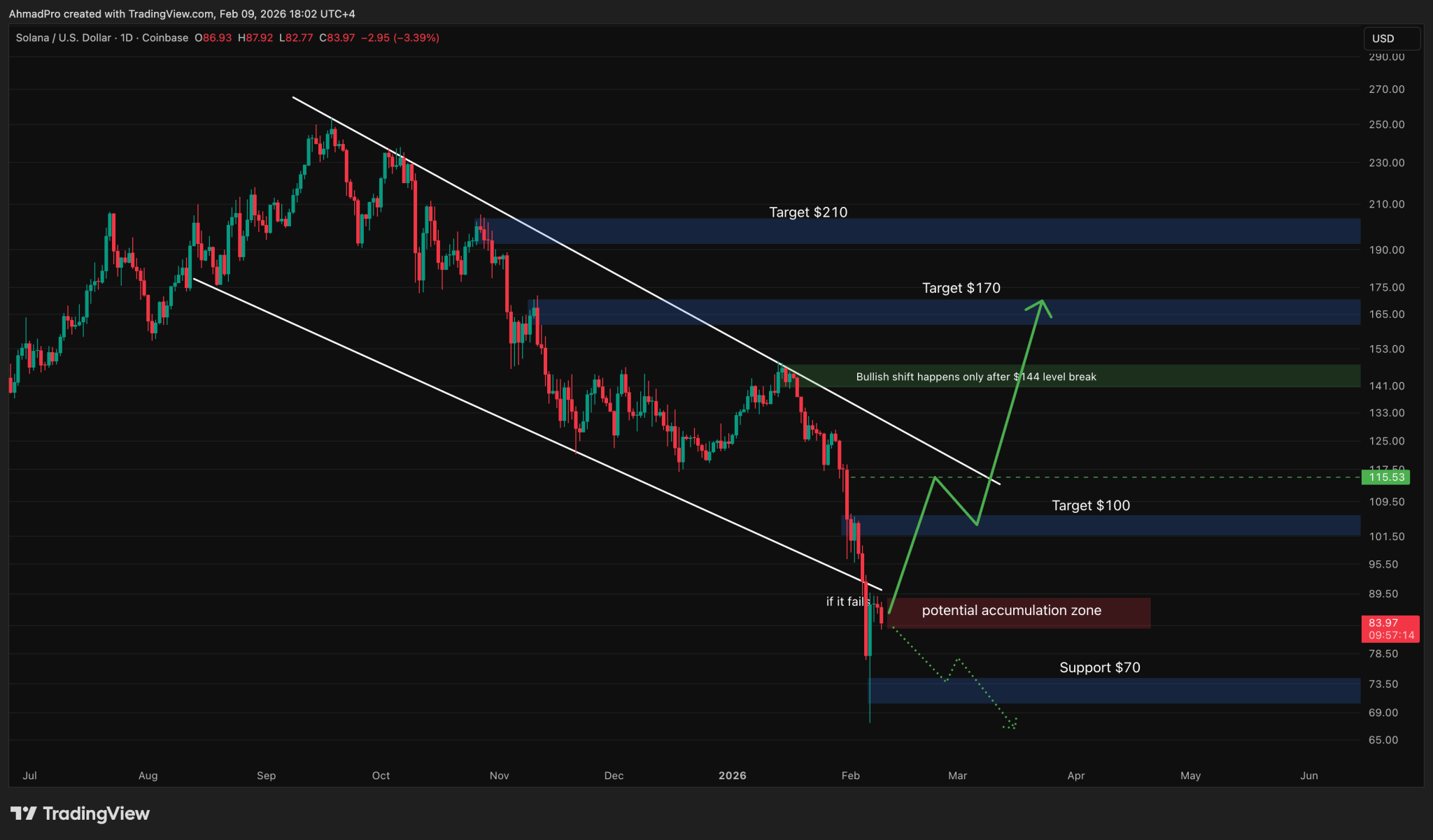 Untuk skenario pemulihan, resistance terdekat berada di sekitar $100. Namun, level yang dinilai paling penting berada di area $144. Analis menyebut bahwa penutupan harga harian di atas $144 akan menjadi sinyal kuat bahwa tren turun berpotensi berakhir dan SOL bisa memasuki fase bullish yang lebih nyata.