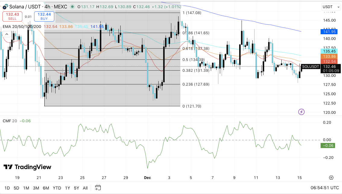 SOL memasuki fase koreksi setelah gagal bertahan di atas area USD 147. Pada grafik empat jam, harga membentuk lower high dan kini bergerak di bawah exponential moving average (EMA) 20, 50, dan 100. Pola ini menegaskan adanya tekanan bearish jangka pendek.