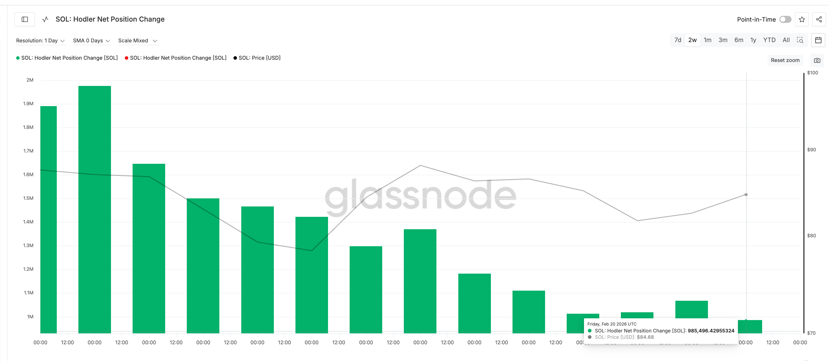 Indikator Hodler Net Position Change menunjukkan perubahan signifikan pada perilaku investor jangka panjang (holder lebih dari 155 hari). Pada 8 Februari, holder jangka panjang menambah hampir 1,98 juta SOL. Namun, pada 20 Februari, angka tersebut turun menjadi sekitar 0,99 juta SOL.