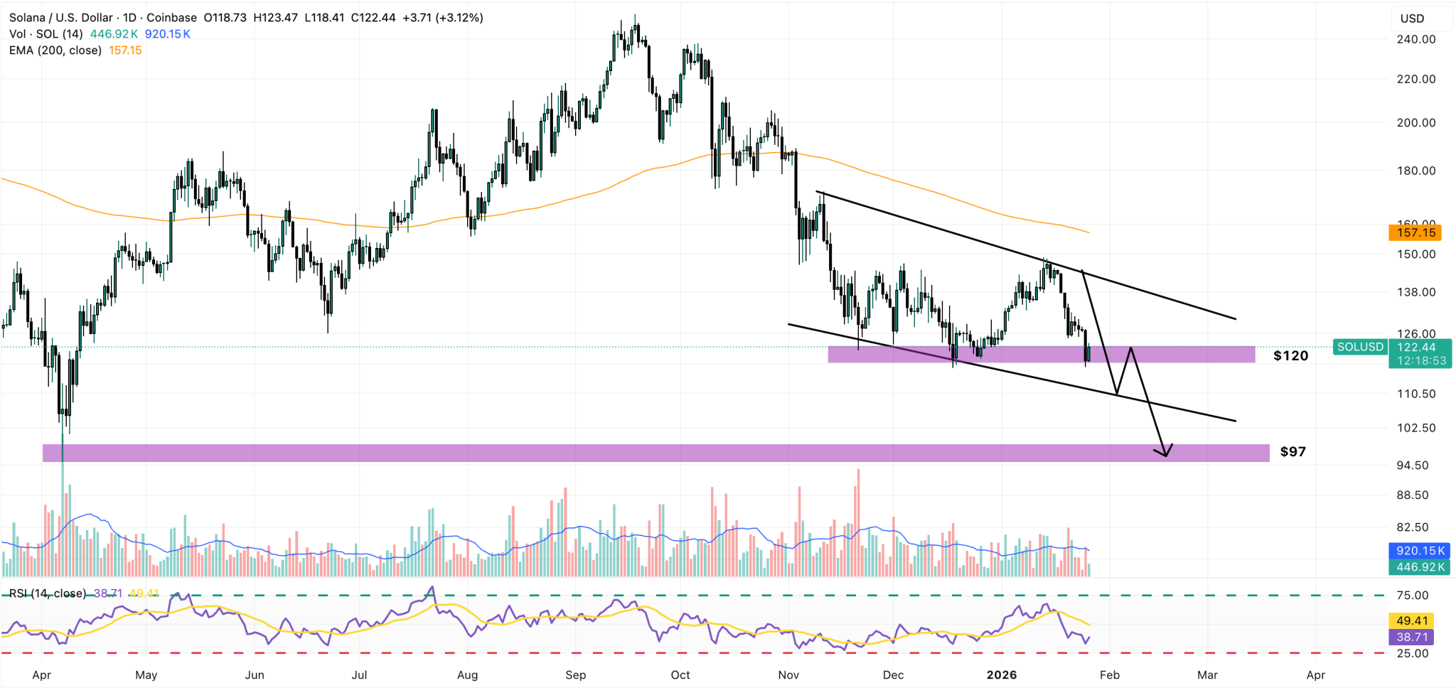 Pada sesi perdagangan Asia, SOL sempat mengalami tekanan jual tajam sebelum akhirnya rebound di area US$120. Pantulan ini menunjukkan bahwa pembeli masih berupaya mempertahankan level penting tersebut, meski sentimen pasar belum sepenuhnya pulih.