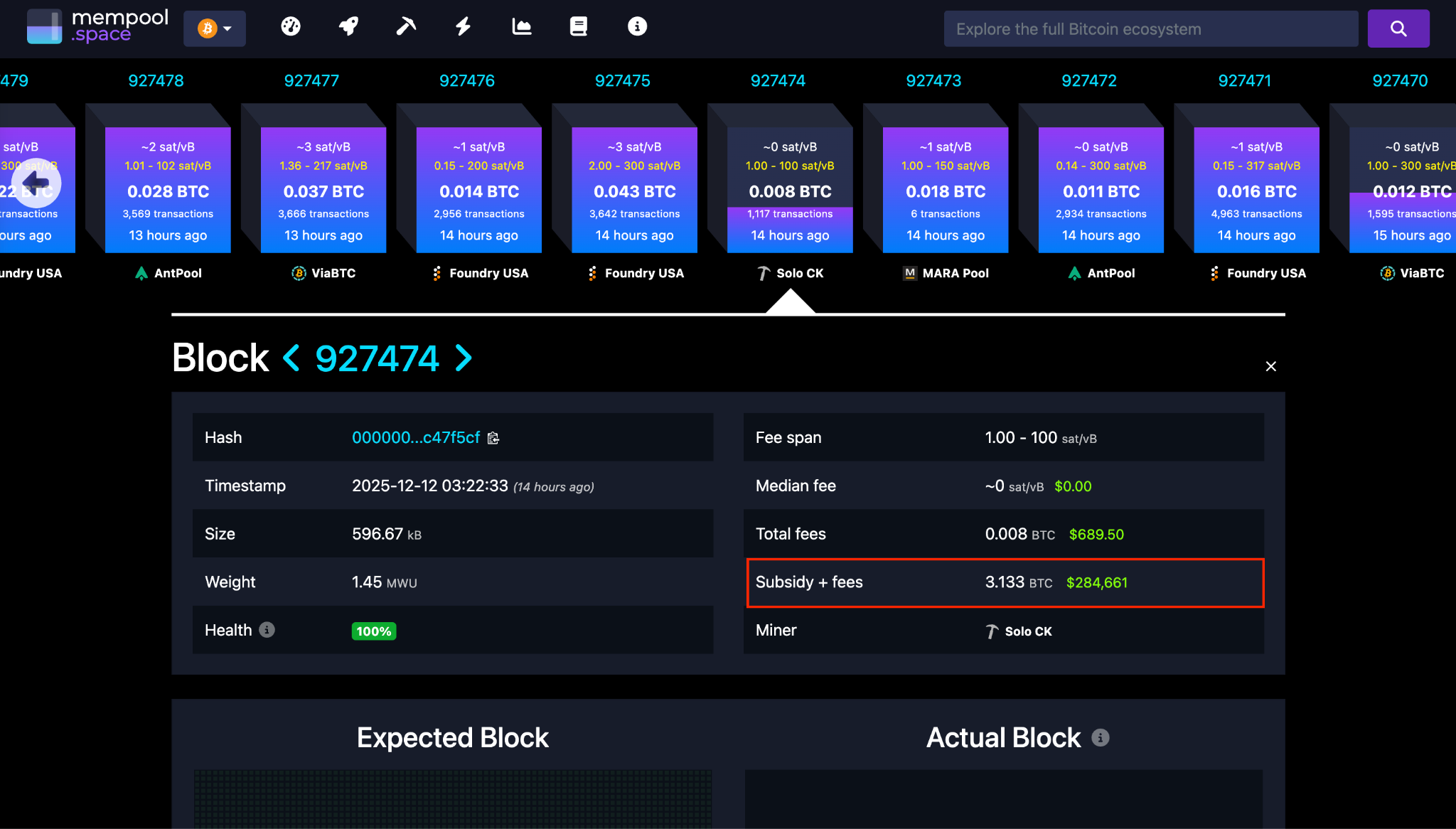 Pada tanggal 12 Desember 2025, seorang miner individu atau lebih sering dikenal dengan solo miner yang menggunakan solo pool dengan Solo CK berhasil menyelesaikan blok Bitcoin nomor 927474. Blok ini memberikan subsidy (hadiah blok) sebesar 3.125 BTC plus biaya transaksi 0.008 BTC, total 3.133 BTC.
