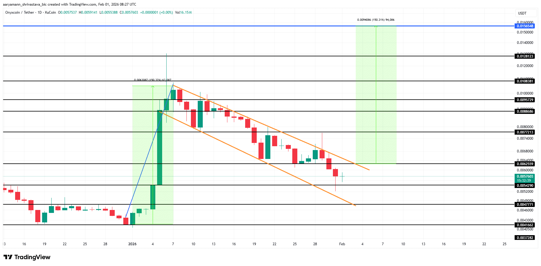 Dari sisi teknikal, Onyxcoin saat ini diperdagangkan di kisaran US$0,0057 dan masih bertahan di atas level support US$0,0054. Selama sebulan terakhir, pergerakan harga membentuk pola bullish flag, yang umumnya mengindikasikan kelanjutan tren setelah fase konsolidasi.