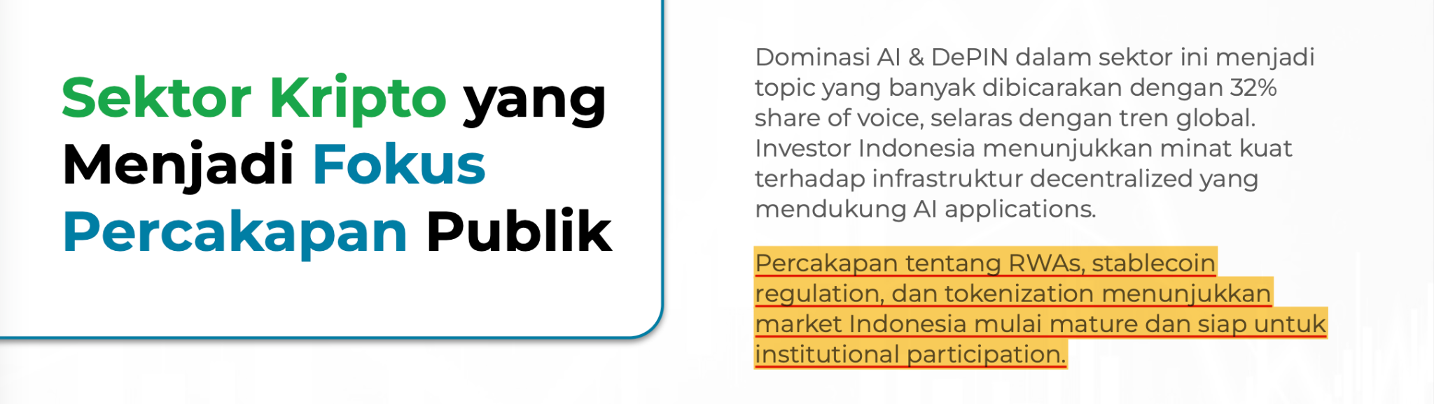 Untuk konteks perbandingan, berikut lima sektor kripto utama yang mendominasi percakapan publik di Indonesia sepanjang 2025 berdasarkan share of voice: