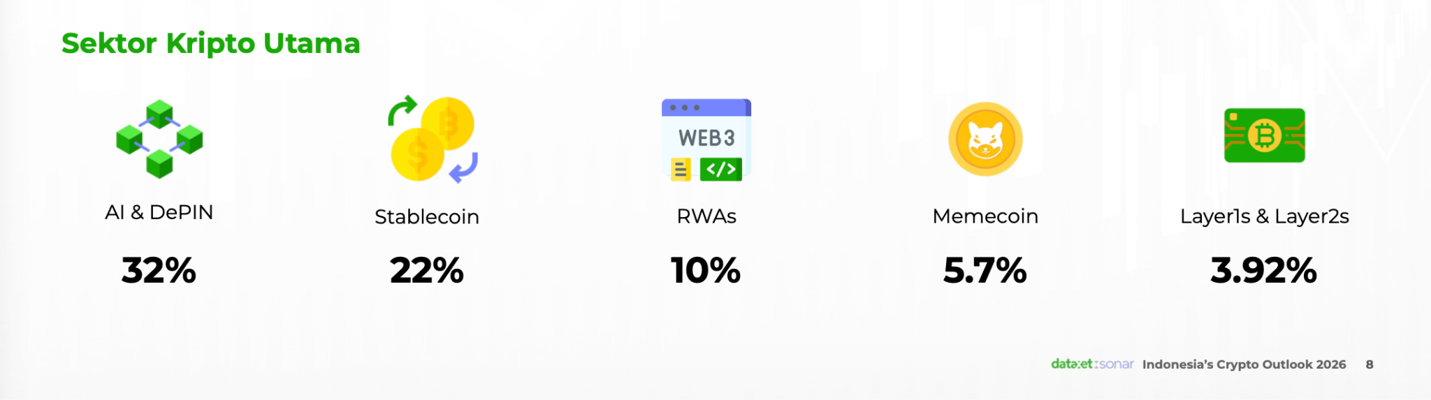 Berdasarkan pemetaan sektor kripto yang menjadi fokus percakapan publik, AI & DePIN (Artificial Intelligence & Decentralized Physical Infrastructure Networks) muncul sebagai sektor paling dominan sepanjang 2025. Sektor ini mencatat 32% share of voice, menjadikannya yang tertinggi dibanding sektor kripto lainnya.