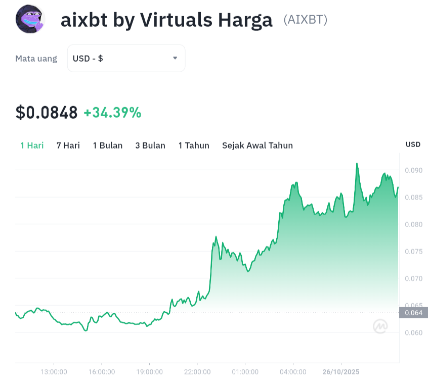 Lonjakan ini menjadikan AIXBT salah satu token dengan performa harian terbaik di pasar kripto global.