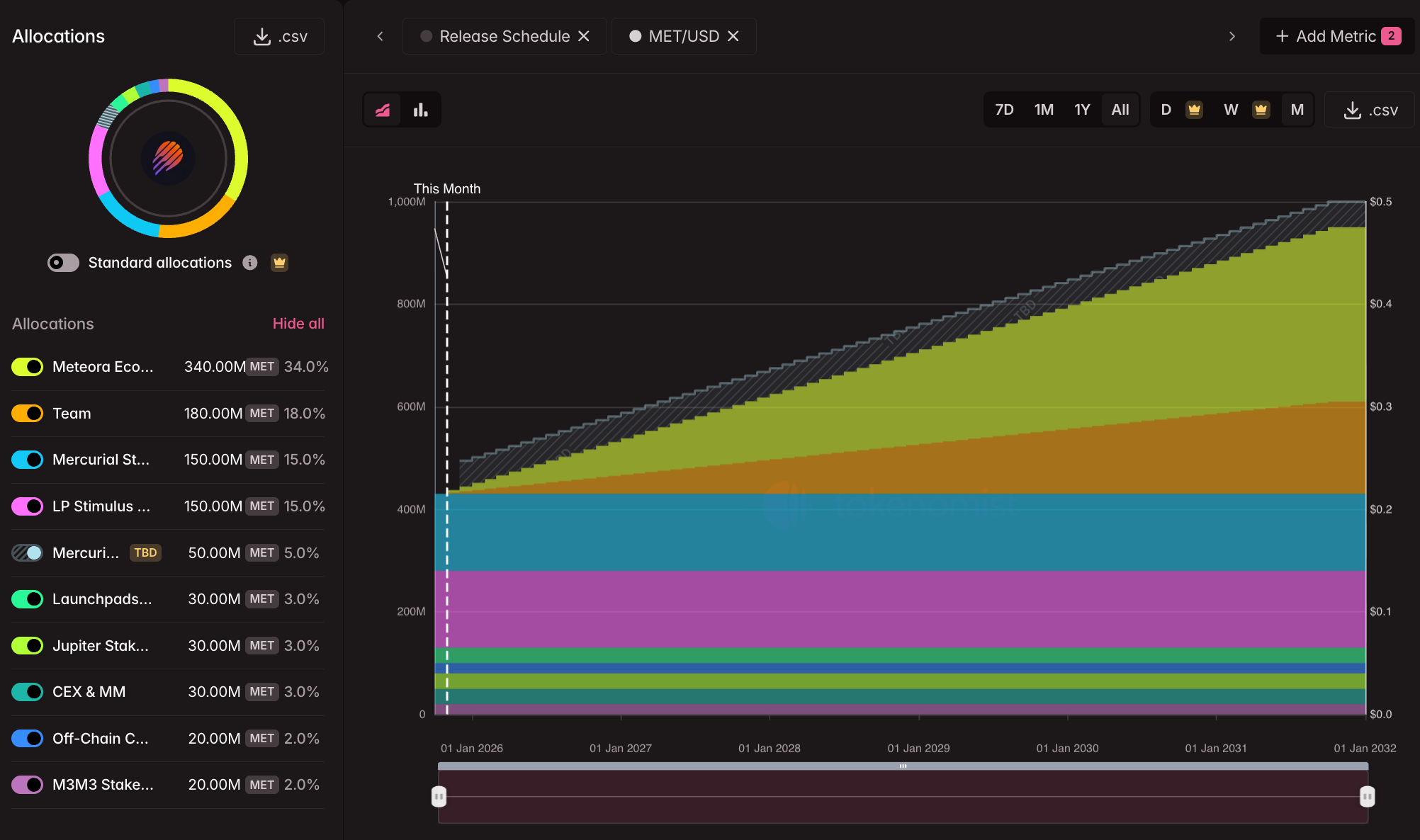 Jadwal vesting dan token unlock MET. Sumber: Tokenomics.ai