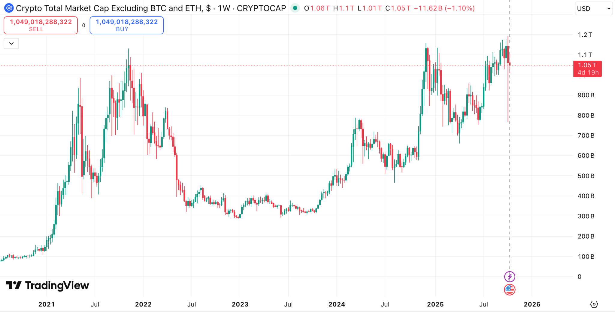 Saat ini TOTAL3 berada pada posisi yang sama seperti harga tertinggi di tahun 2021, sebelumnya pada saat pasar kripto mengalami flash crash karena berita tarif Donald Trump, TOTAL3 sempat terjun 35% sebelum akhirnya kembali memantul.