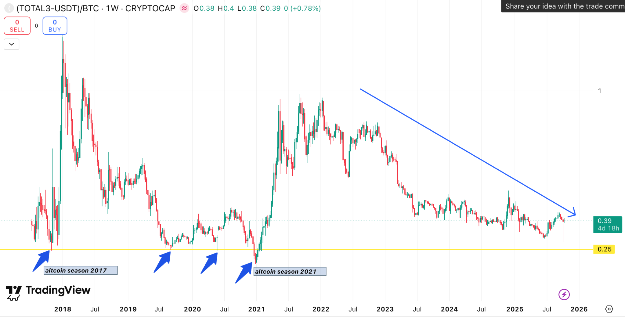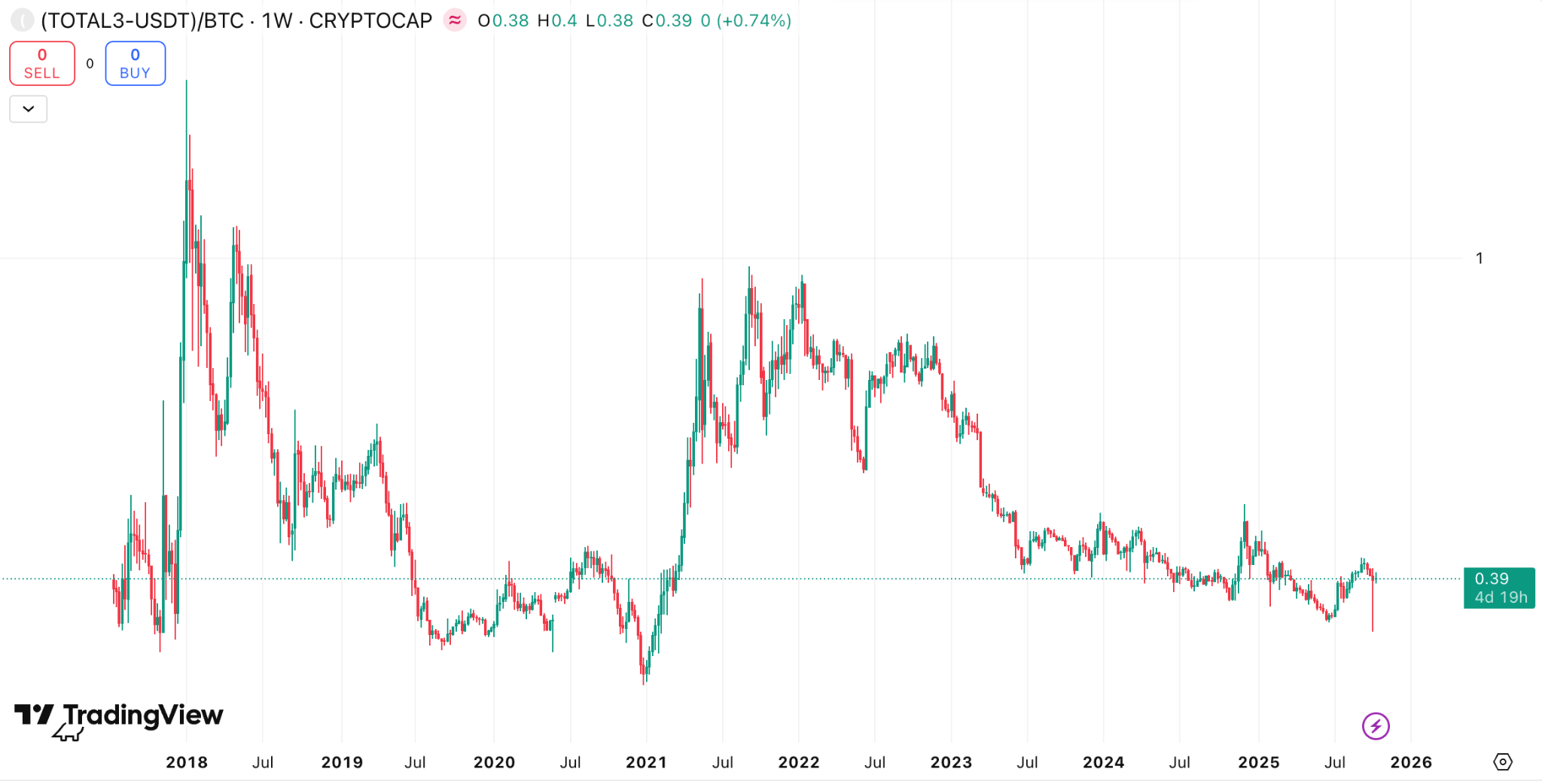 Jika melihat grafik terbaru antara (TOTAL3-USDT)/BTC maka pasar altcoin kini hanya setara dengan 39% dari Bitcoin yang menunjukkan altcoin secara struktural terus melemah terhadap Bitcoin, dan bahwa rotasi modal kembali ke “raja kripto” sedang berlangsung.