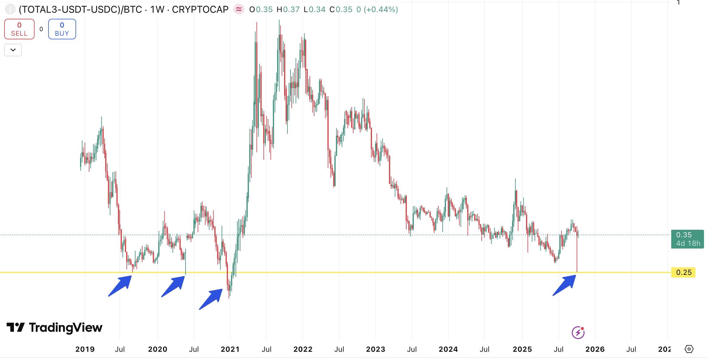 Dari pola historis, (TOTAL3-USDT)/BTC sering kali mengalami kenaikan yang memicu altcoin season setelah mencapai bottom di area 0.25. Sedangkan hingga akhir 2025 ini (TOTAL3-USDT)/BTC masih belum pernah menyentuh level 0.25 dan secara keseluruhan terus menurun dan membentuk lower high.