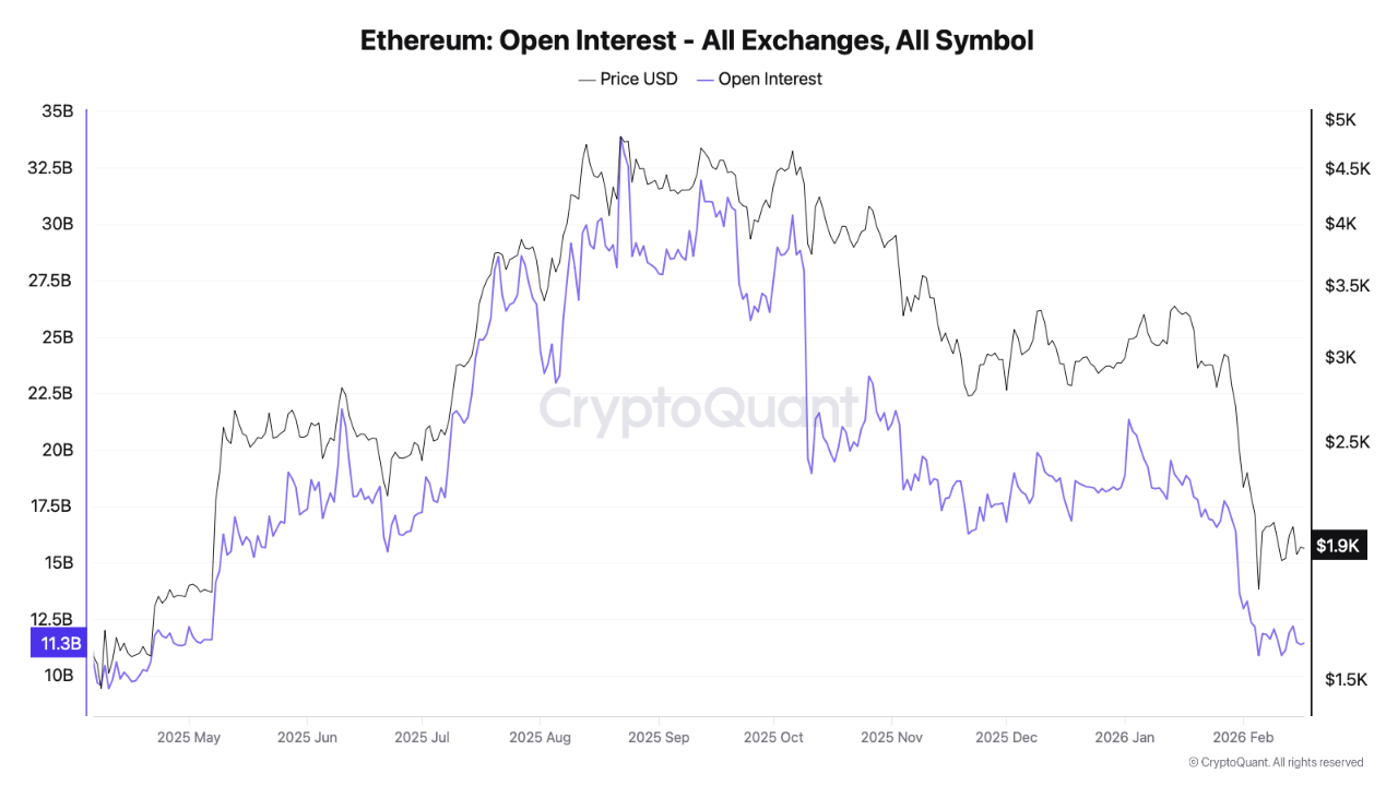 Data terbaru mencatat open interest Ethereum turun lebih dari 66%, dari sebelumnya US$33,3 miliar menjadi hanya sekitar US$11,4 miliar. Penurunan ini berarti nilai notional yang tersimpan dalam kontrak futures ETH menyusut hingga sepertiga, menegaskan adanya pelemahan aktivitas perdagangan derivatif secara masif di tengah meningkatnya ketidakpastian pasar.