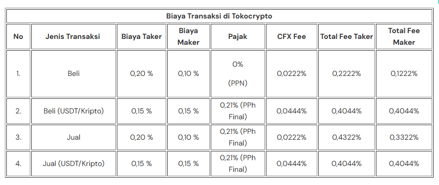 Sedangkan untuk perdagangan menggunakan pair USD, struktur biayanya sedikit berbeda. Baik transaksi beli maupun jual, biaya maker dan taker tetap sama, yaitu 0,15%, ditambah pajak PPh final 0,21% dan CFX Fee 0,0444%. Dengan demikian, total biaya transaksi untuk beli atau jual menjadi 0,4044%, baik bagi taker maupun maker.