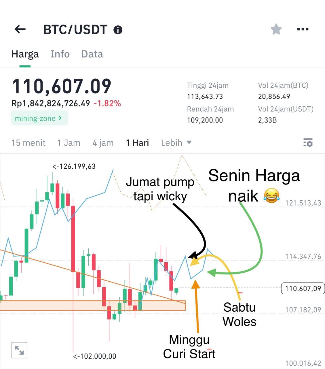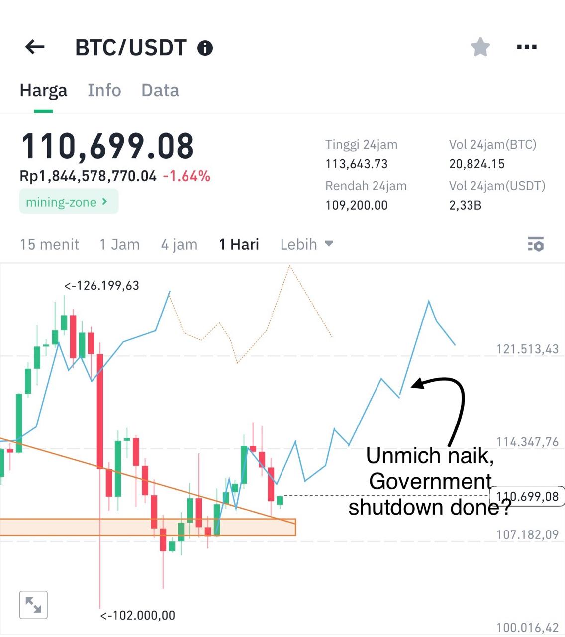 Minggu lalu saya tekankan bahwa Unmich akan sangat pandai menggambarkan inflasi setahun kedepan dan prediksi turun di 4,6%. Menurut saya dengan Pemerintah AS yang shutdown, saya pikir Unmich juga akan memprediksi bahwa inflasi AS akan turun lagi. Sehingga DXY menguat disini dan Bitcoin koreksi. Setiap hari Jumat selalu ada wick dikarenakan esoknya adalah weekend, Kira-kira begini Candle hari Jumat: