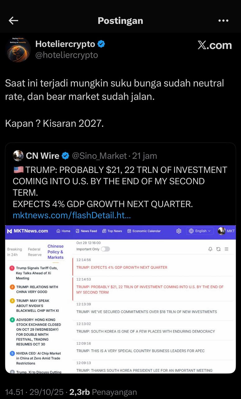 Saya akan menambahkan analisa, investor untuk investasi dalam negeri itu tidak instant, setelah dapat, efeknya itu masih perlu beberapa tahun, contohnya investasi pembangunan pabrik mobil, membutuhkan waktu 5 tahun hingga produksi mobil pertama, Trump mengatakan bahwa boleh jadi di akhir periode kepemimpinannya yaitu 2028, Investasi itu sudah capai 21.2 Trillion dollar. Saat itu terjadi, saya yakin Fed sudah siap dan mungkin sudah menaikkan suku bunga, sehingga boleh jadi bear market sudah datang bahkan sudah jalan: