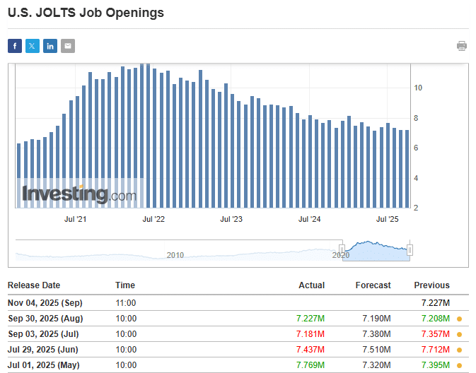 Ini kan bulan November 2025, seharusnya laporannya untuk bulan Oktober, tetapi perhatikan, laporan datanya itu masih bulan September yaitu sebelum shutdown, jadi menurut saya Jolts masih akan naik, dan Bitcoin koreksi tipis di hari Selasa: