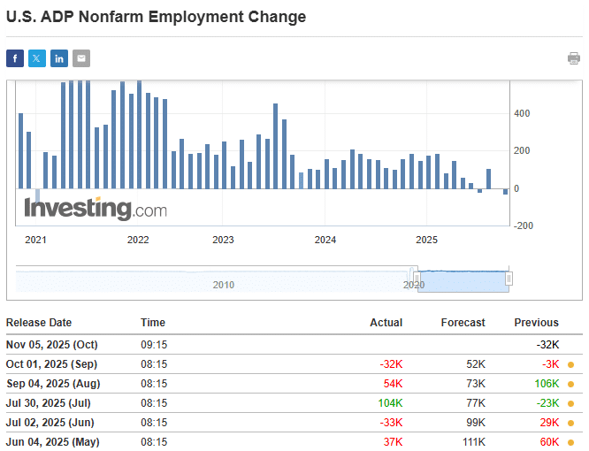 Beda dengan Jolts, ADP yaitu jumlah karyawan Swasta akan dilaporkan actual untuk bulan Oktober 2025. Saya ingin sekali mengatakan bahwa ADP akan jatuh tetapi angkanya itu sudah -32K. Dan ini adalah laporan utuh tentang Pegawai Swasta bukan Pegawai Negeri, Sehingga menurut saya ditengah Trump yang koar-koar investasi luar negeri dari hasil lawatannya menghasilkan banyak pekerjaan.