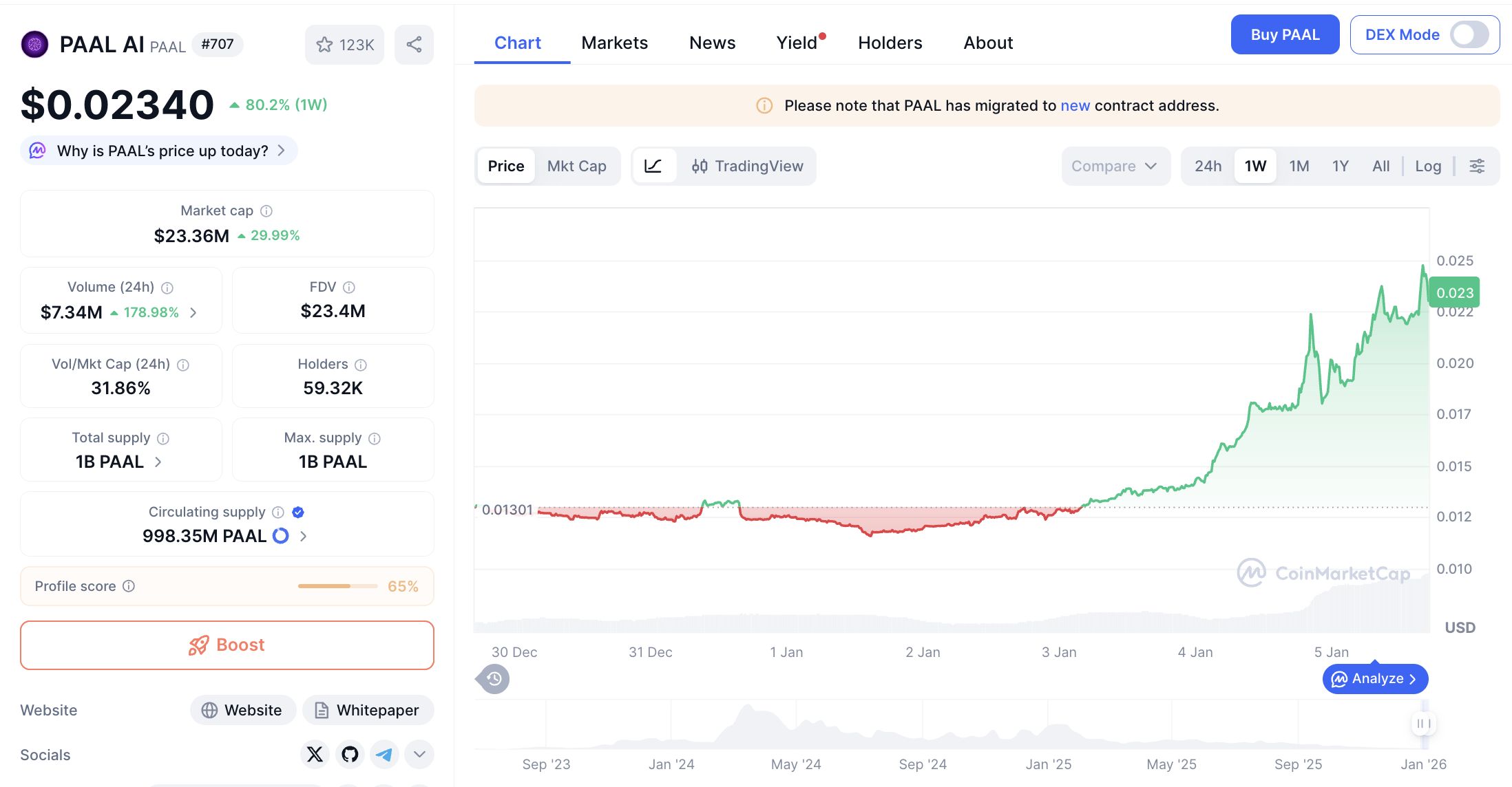 Kapitalisasi pasar PAAL mencapai $22,968,989, dengan volume perdagangan harian sebesar $7,332,898. Suplai beredar PAAL saat ini tercatat 308.51 juta token.