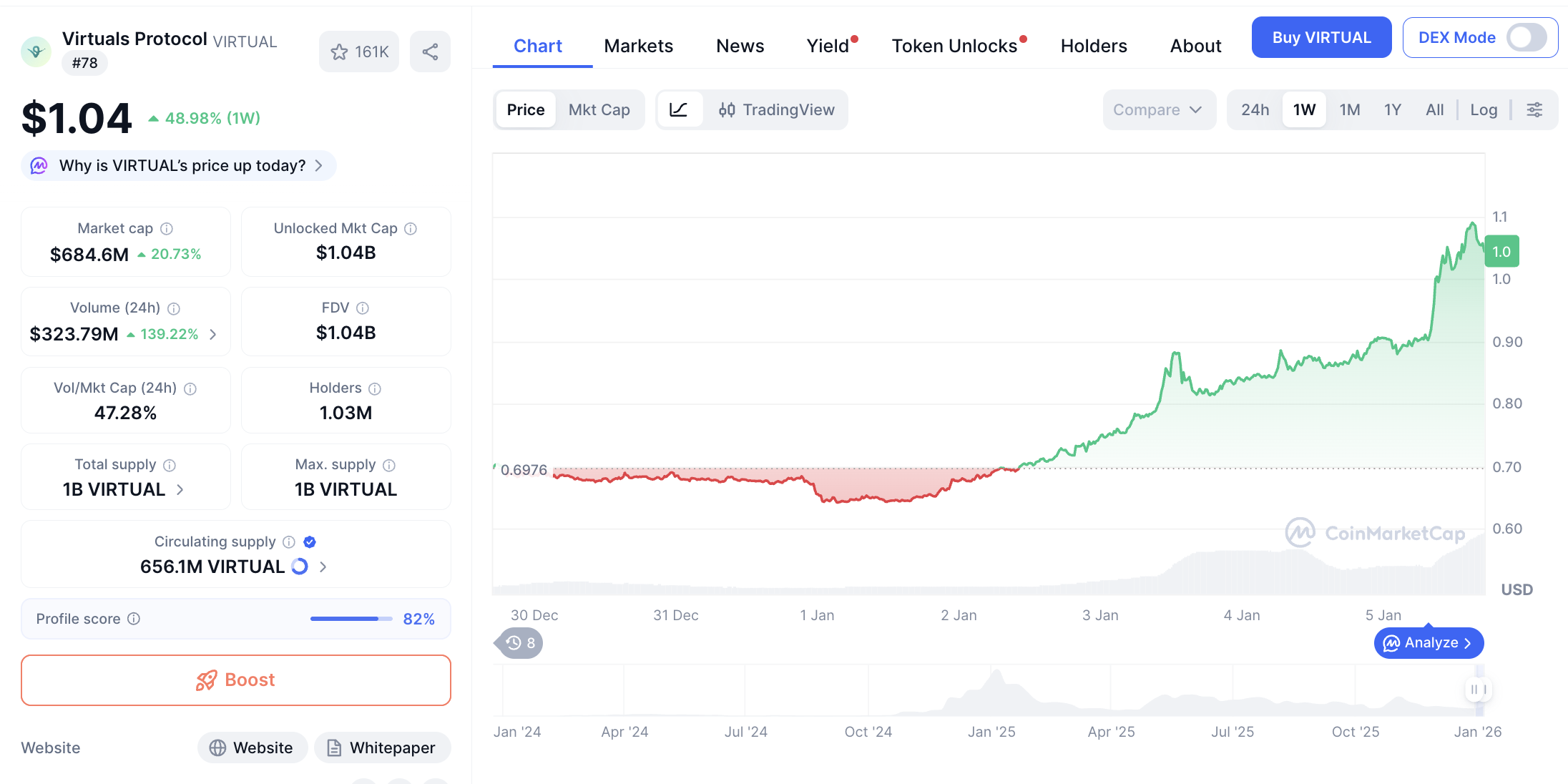 Virtuals Protocol menjadi token generative AI dengan kapitalisasi pasar terbesar saat ini. VIRTUAL diperdagangkan di harga $1.04, naik 20.72% dalam 24 jam dan menguat 48.94% dalam 7 hari terakhir.
