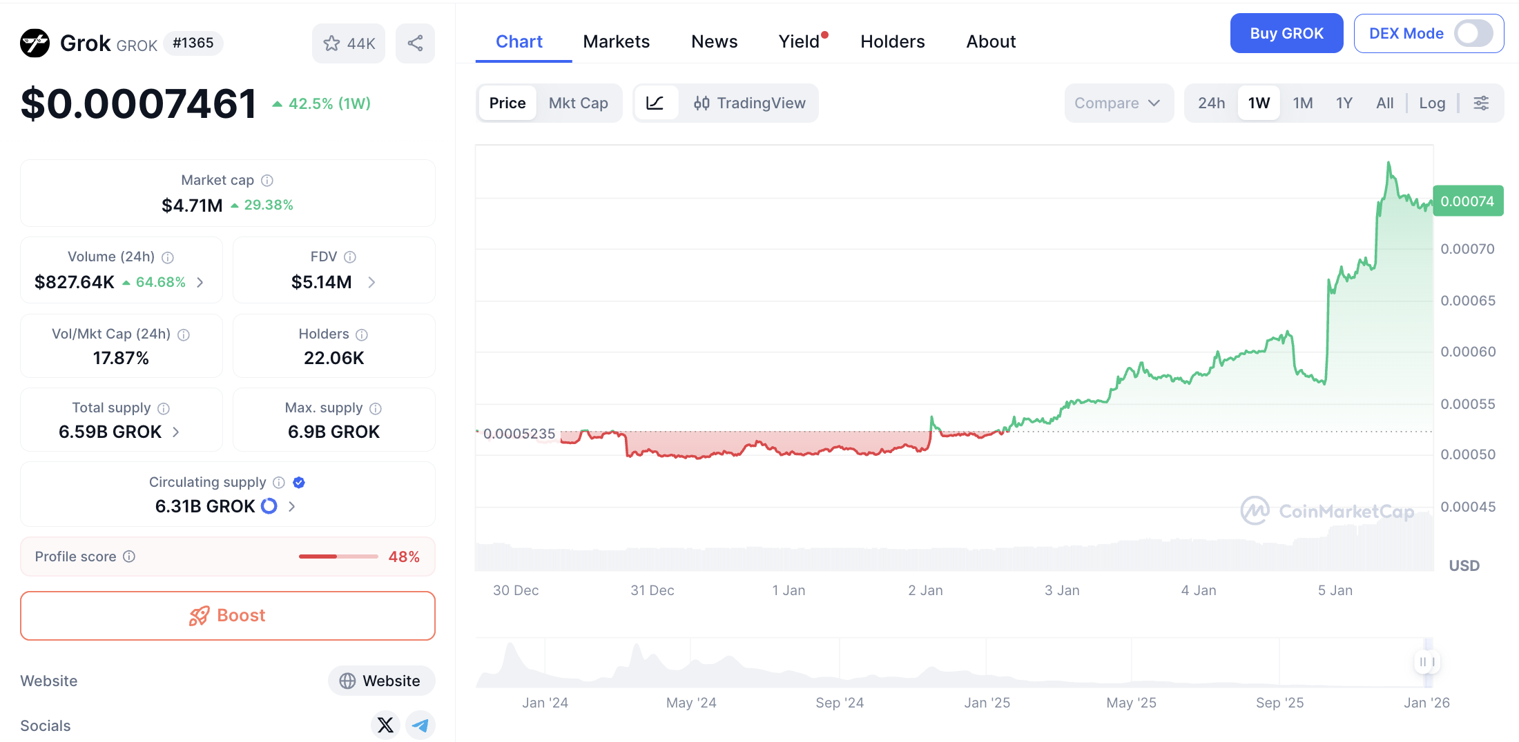 Market cap GROK berada di level $4,691,323 dengan volume transaksi harian sebesar $838,702. Jumlah suplai beredar token ini mencapai 1.12 miliar GROK.