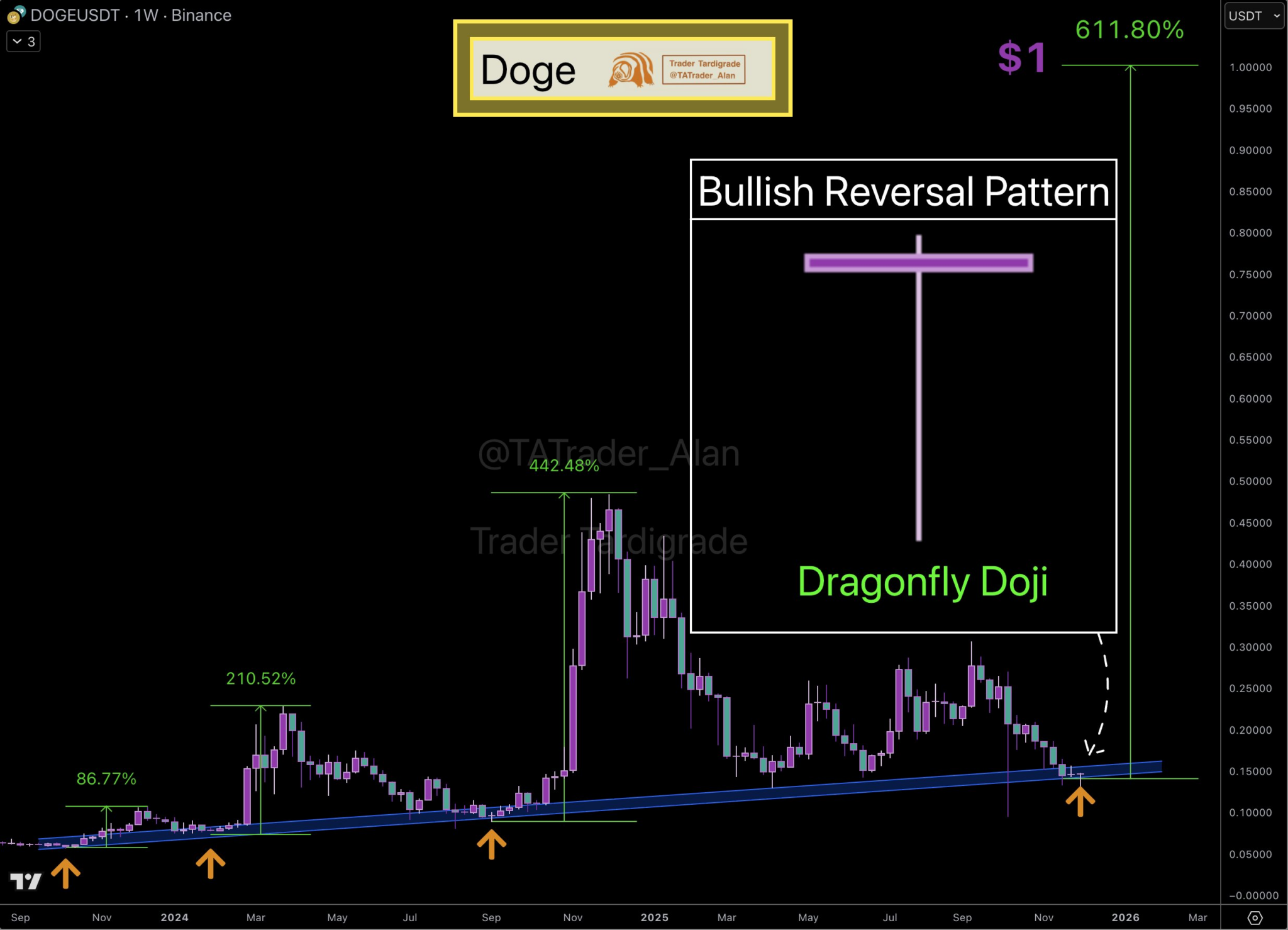 Optimisme juga datang dari para analis. Trader Tardigrade melihat pola Dragonfly Doji di grafik mingguan yang muncul tepat di area support kuat $0,15. Jika level ini bertahan, ia menilai DOGE berpotensi menargetkan $1.