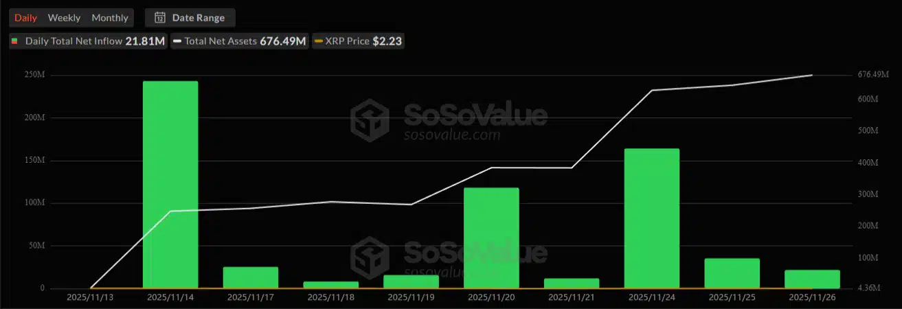 Total aset ETF XRP kini mencapai $676,49 juta, setara 0,50% kapitalisasi pasar XRP, menunjukkan masuknya arus dana institusional secara agresif meski kondisi pasar kripto tengah bergejolak.