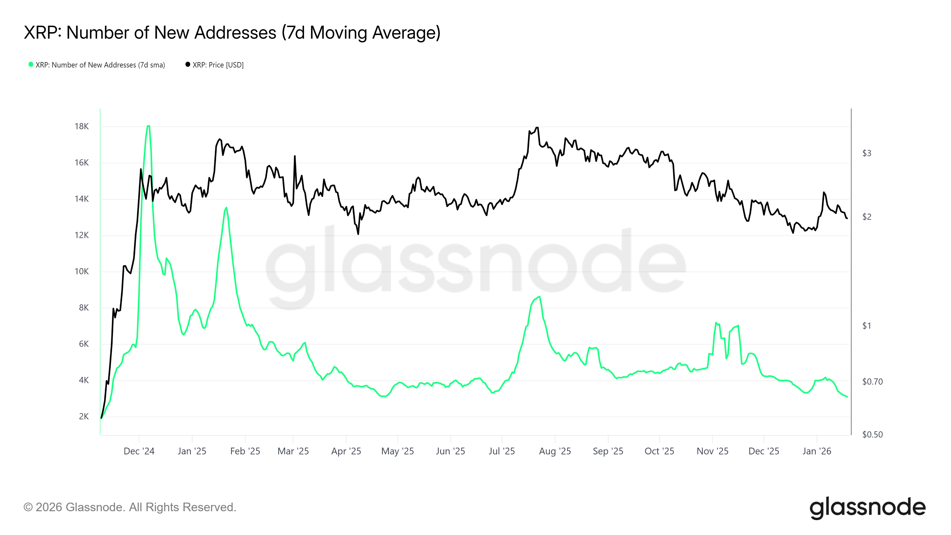 Di sisi lain, indikator fundamental jaringan justru menunjukkan sinyal kehati-hatian. Jumlah alamat baru XRP tercatat turun ke level terendah dalam 13 bulan, yakni sekitar 3.090 alamat. Penurunan ini mencerminkan melemahnya minat investor baru untuk masuk ke ekosistem XRP.