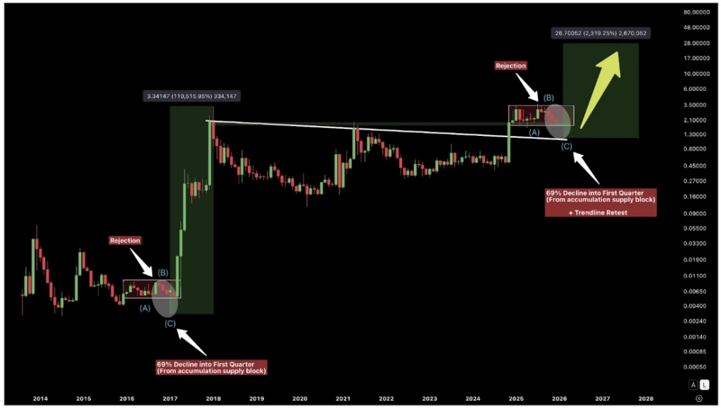 Jika pola historis kembali terulang, peluang kenaikan signifikan diperkirakan baru akan terbuka pada 2026. Dari zona reset tersebut, grafik proyeksi menunjukkan potensi pergerakan menuju level ekstensi Fibonacci 1.618, dengan target jangka panjang di sekitar USD 27 atau setara kenaikan sekitar 2.300% setelah fase koreksi berakhir.